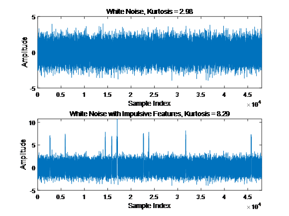 如许从命正态散布的数据的峰度值为0,因为正态散布的四阶中间矩与方差平方的比值刚好即是3。简略来讲,峰度能够用来描写旌旗灯号的非安稳特点,出格是短时候内突发的噪声搅扰,若是一段数据的峰度值越大,则标明该段数据中含有的突发性噪声搅扰成份较多。上面以一段数据阐发对照为例,接纳旌旗灯号仿真方式天生一组随机白噪声旌旗灯号和一组增添有突发性打击搅扰的白噪声旌旗灯号,别离计较两组旌旗灯号的峰度值能够发明,含有突发性打击特点搅扰的白噪声旌旗灯号的峰度值为8.29,较着大于不含有搅扰的白噪声旌旗灯号2.98。